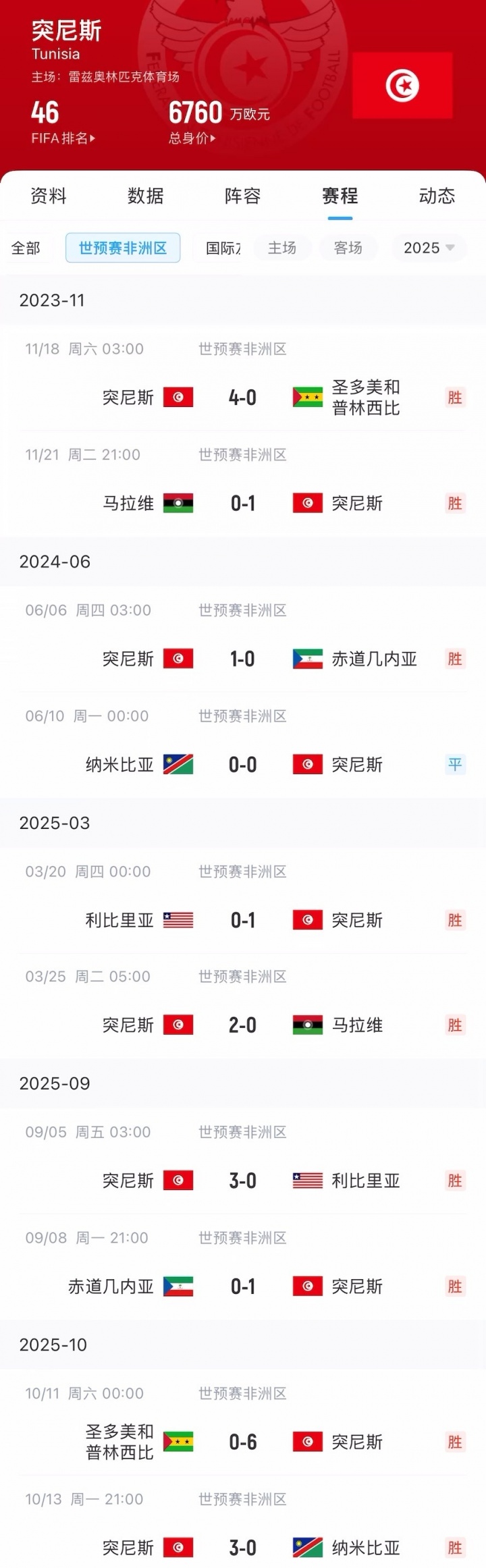 在本阶段世预赛中,突尼斯除了客战纳米比亚时0-0战平,其他场次全部取胜且一球未失。